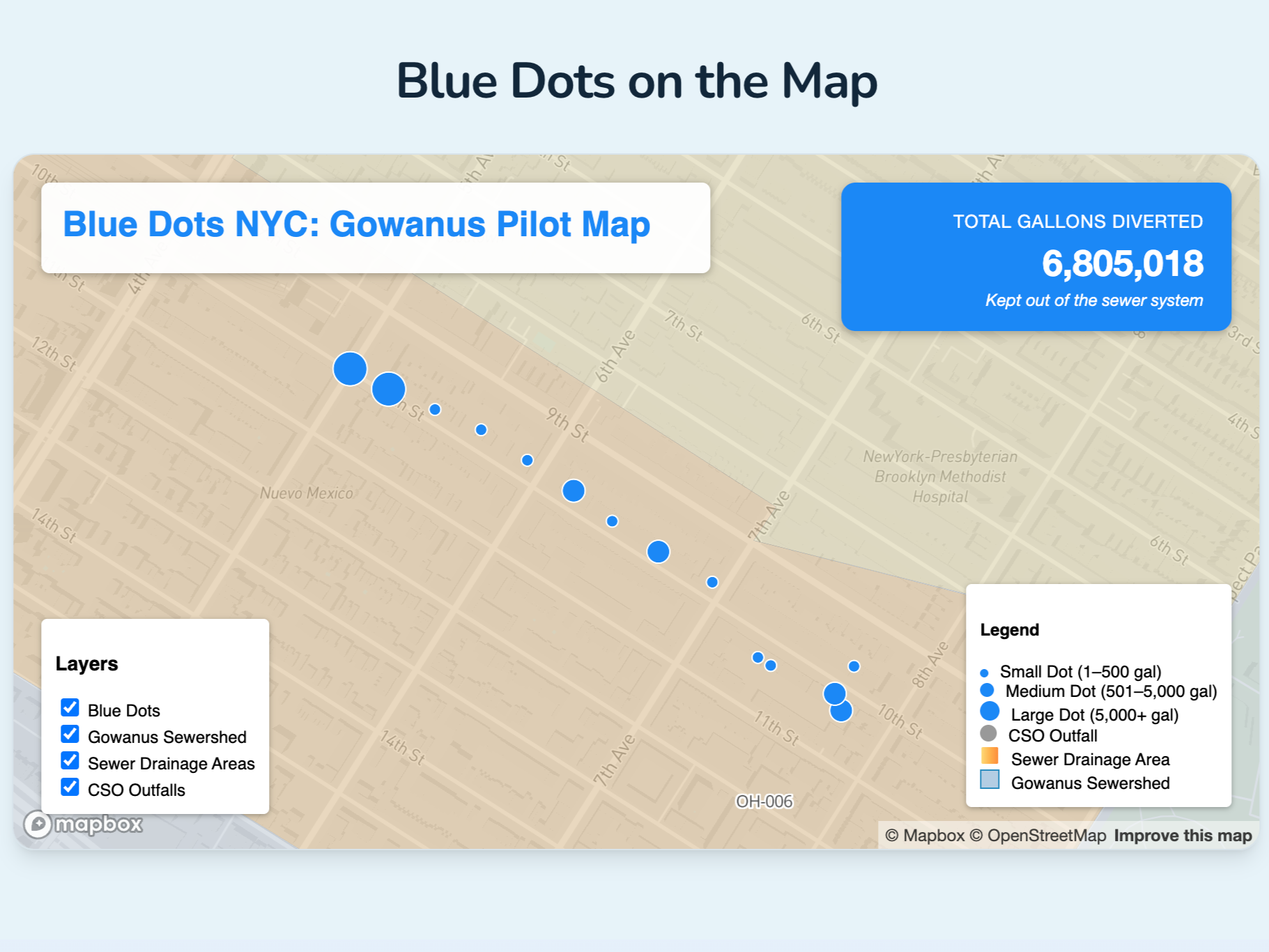 We use performance data from the NYC DEP Green Infrastructure reports to estimate stormwater capture and avoided combined sewer overflow. Each property's impact is calculated based on the specific solutions implemented and aggregated to show community-wide benefits.