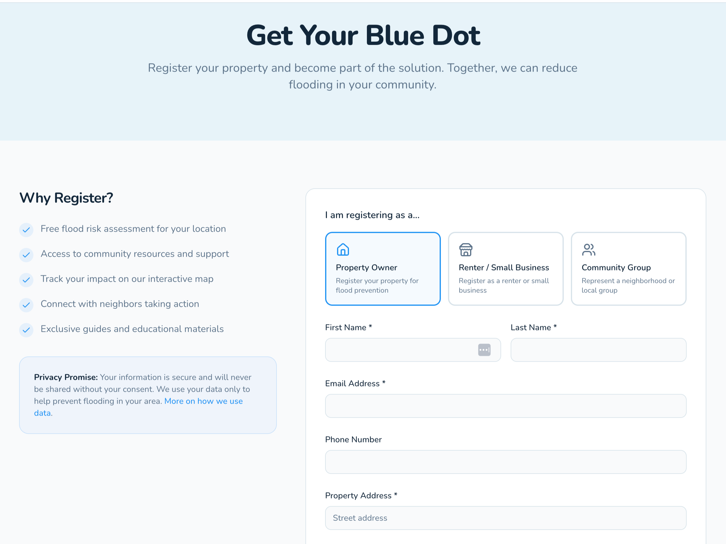 Blue Dots is a property-based flood prevention platform. It helps homeowners, renters, and neighborhood partners identify practical mitigation actions — and turn individual flood exposure into visible, block-by-block resilience.