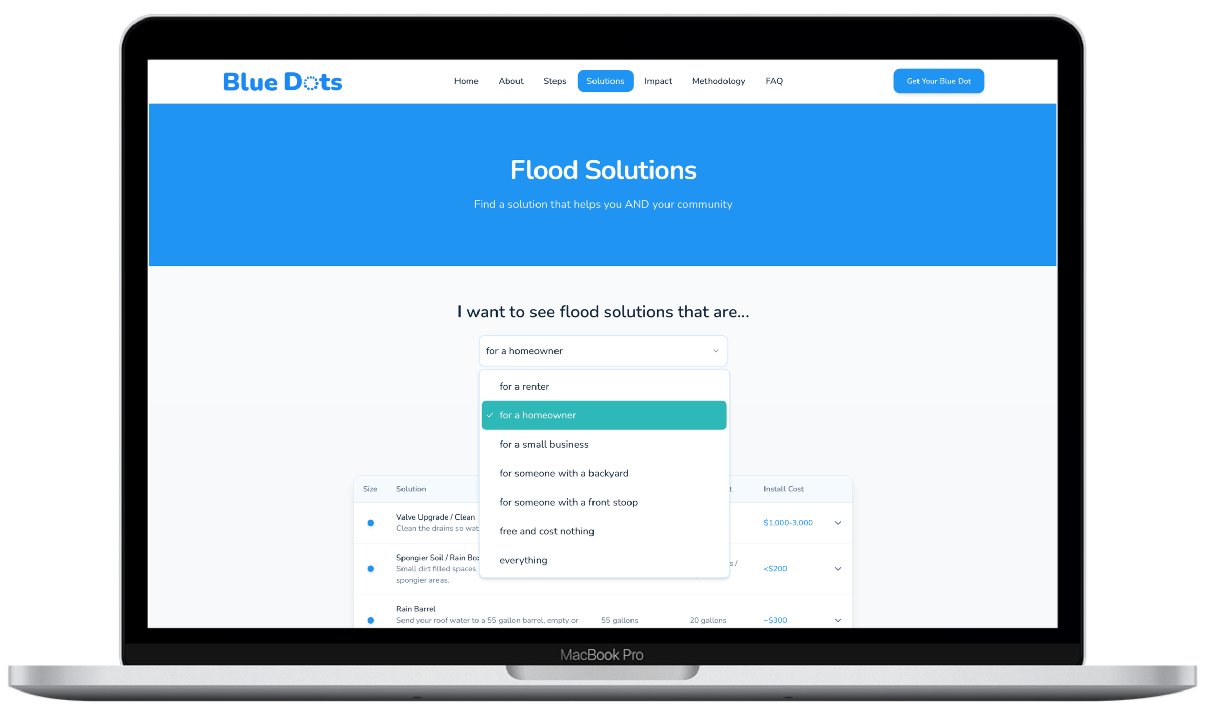 Blue Dots is free: so using the site, finding your solution and registering for a Blue Dot cost nothing. Implementing a solution can have varying degrees of cost, depending on what you need and if there are any rebates, incentives you qualify for (which we also hope to connect you to). When appropriate, we provide a link to a separate flood-related web site (The City Sponge) where you can see local trades who specialize in these solutions, products/services related to flooding, gov't grants as well as local community partners who offer resilience-focussed financing. We want to help you at all steps so it gets done.