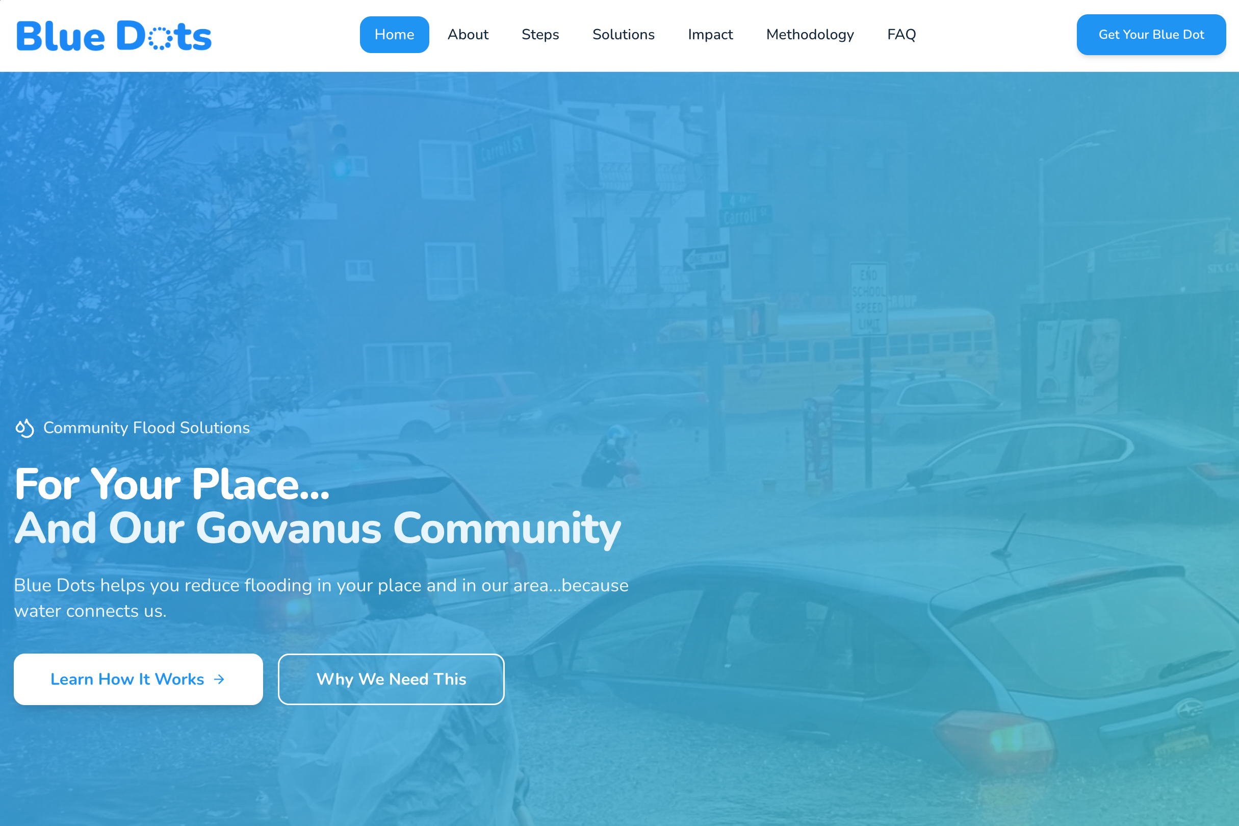 Blue Dots helps you understand your flood exposure, compare property-based solutions, and contribute to visible neighborhood resilience.